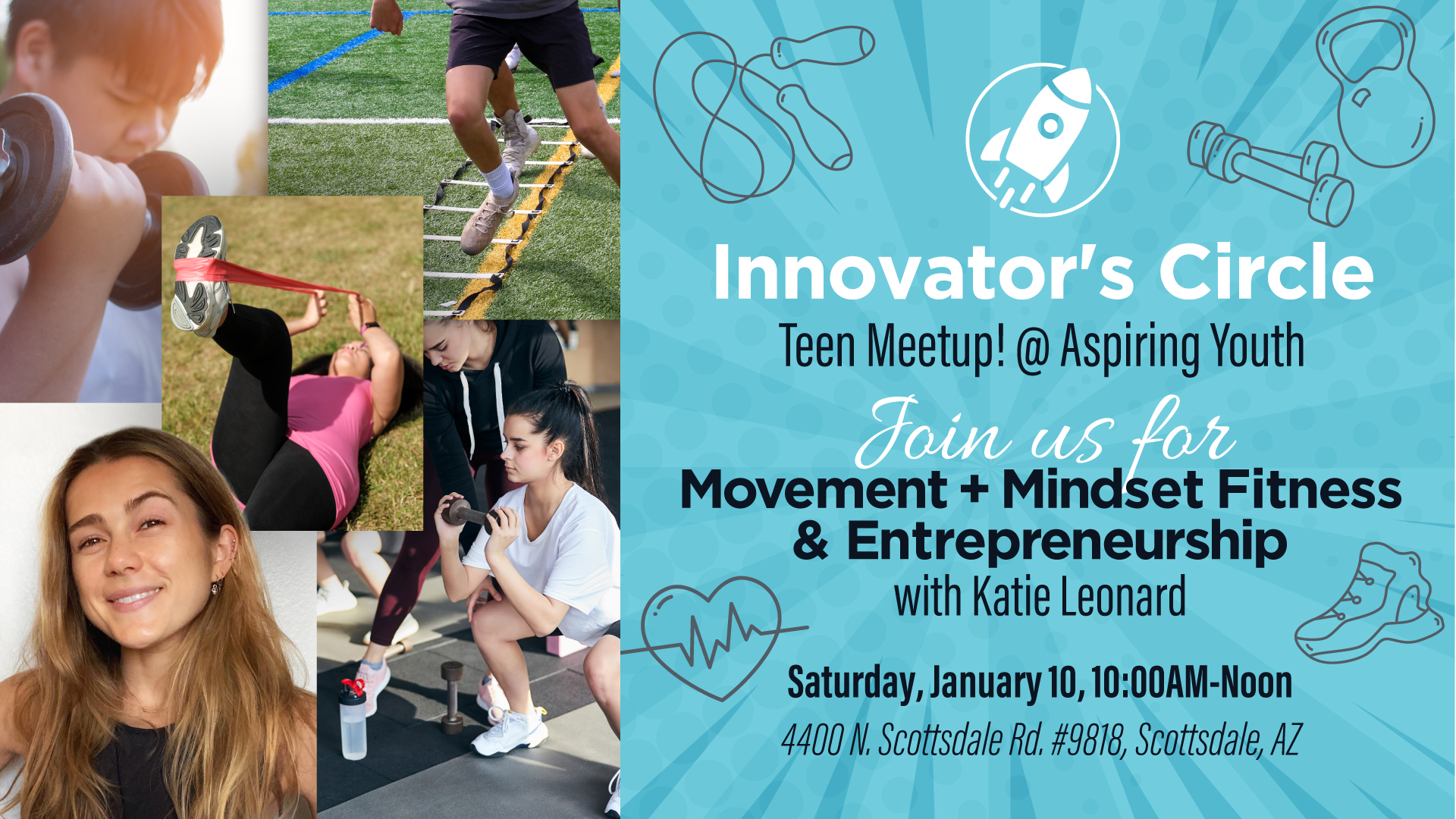 Aspiring Youth Academy 4400 N. Scottsdale Rd. #9818, Scottsdale, AZ, United StatesJoin us on Saturday, January 10 from 10 - Noon, for a high-energy, circuit-style workout led by wellness entrepreneur Katie Leonard. This session blends bands, dumbbells, and agility ladders for a mix of strength, speed, and endurance. Expect squats, lunges, curls, skaters, ladder runs, and more — all set to motivating music in a Tabata-inspired […]